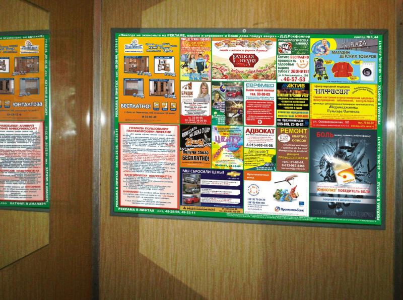 - Размещение рекламы в лифтах и подъездах многоэтажных домов города;